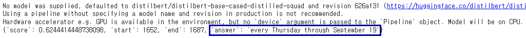 score 는 딥러닝 모델이 답변에 대한 확신 정도를 나타내고, start와 end는 답변의 기반이 되는 기사 내용의 위치이다.