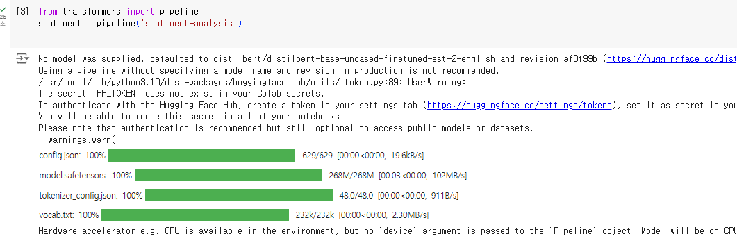 트랜스포머 라이브러리를 파이프라인 형식에 맞추어 'sentiment-analysis' 를 입력하고 인스턴스화 (실행) 시키면 아래와 같이 Distillbert 모델에 사전 학습된 감정 분석 기능이 불러와진다.